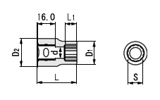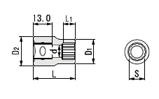 | 製品番号 | 二面幅寸法S(mm) | D1(mm) | D2(mm) | L1(mm) | L(mm) | d(mm) | A | B | 質量(g) | 定価 | 価格(税込) | |